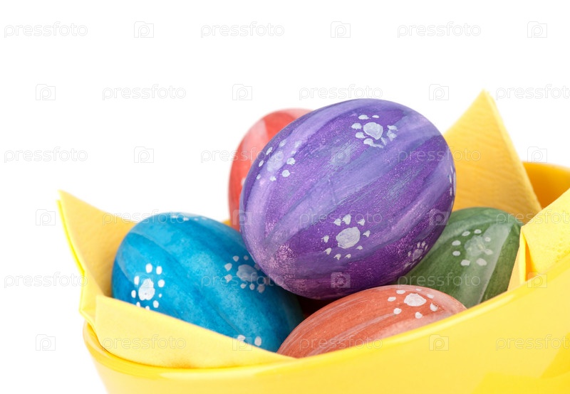 Пасхальные цветные яйца в тарелке на белом фоне