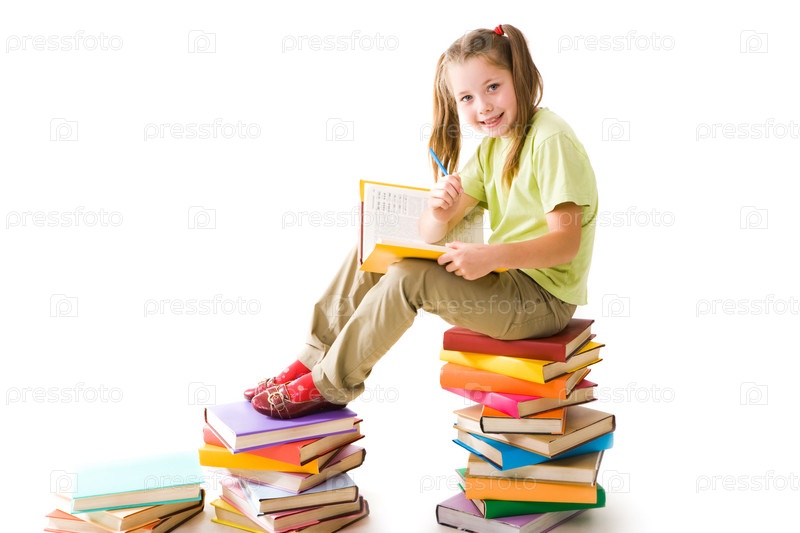 Портрет симпатичной школьницы, сидящей на вершине кучи с открытой книгой и смотрящей в камеру
