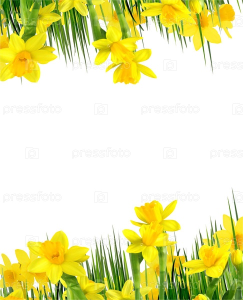 Весенние цветы и трава на белом фоне