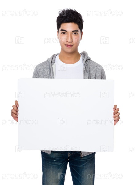 Азиатский молодой парень с белым баннером