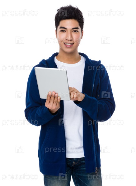 Азиатский молодой парень с цифровым планшетом