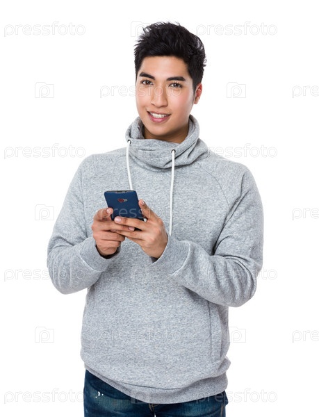 Азиатский молодой парень с мобильным телефоном