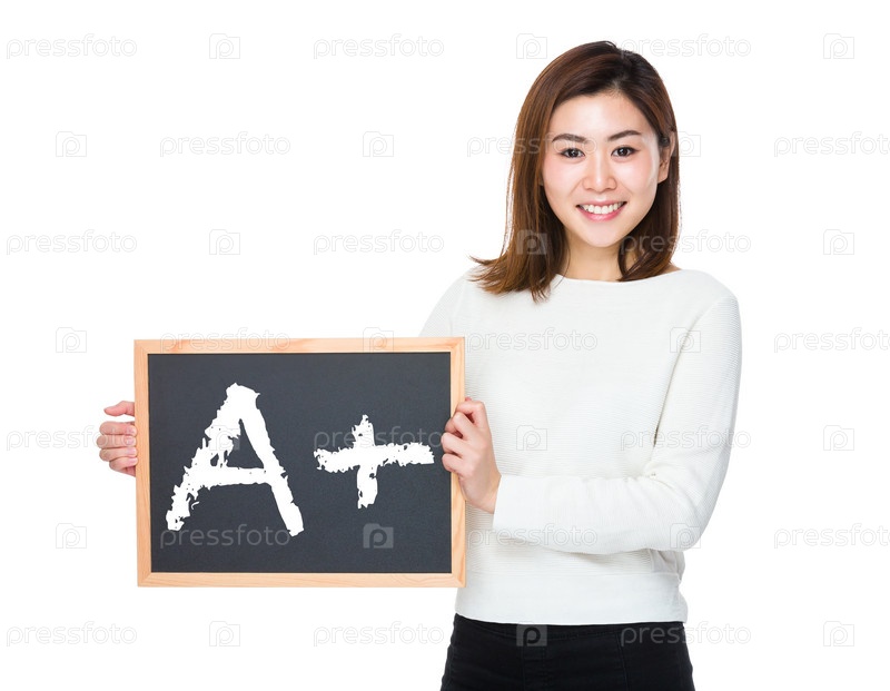 Студентка показывает табличку, концепция образования