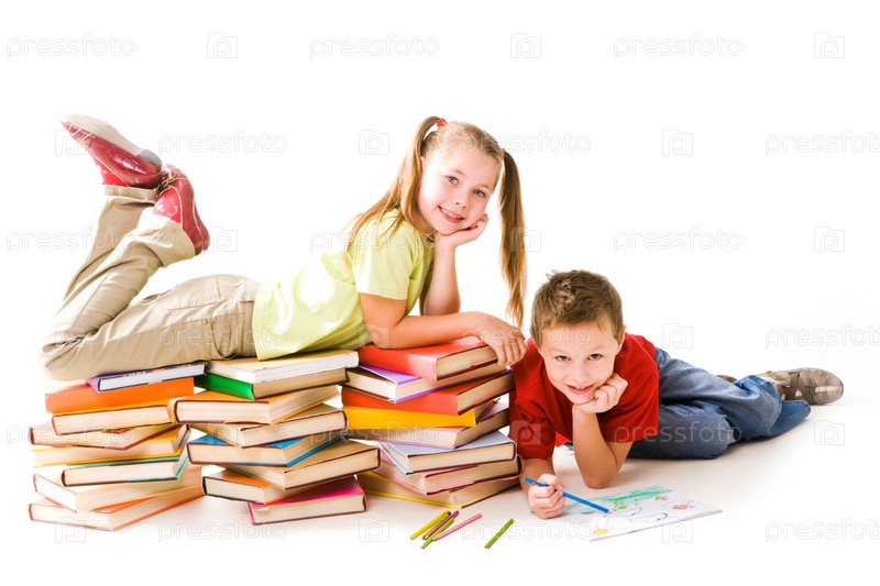 Умная девушка лежит на вершине кучи книг с милым школьником, рисующим рядом