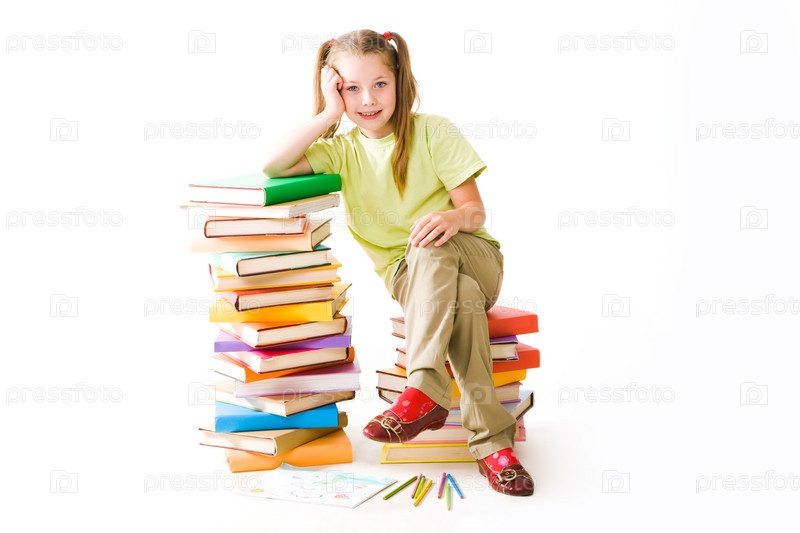 Портрет умной школьницы, сидящей на вершине кучи книг и смотрящей в камеру