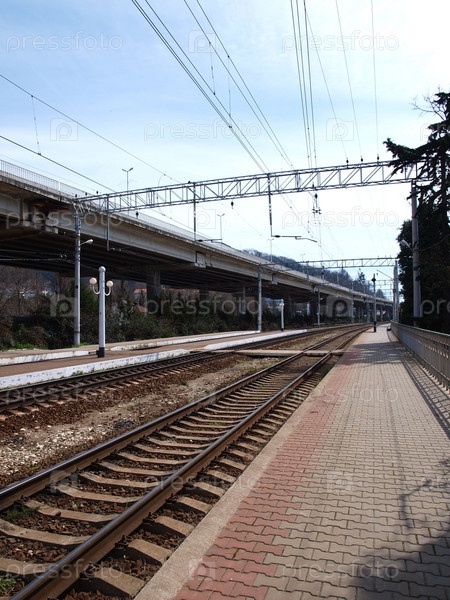 Железная дорога у берега Черного моря станция Хоста, слева эстакада в сторону Адлера