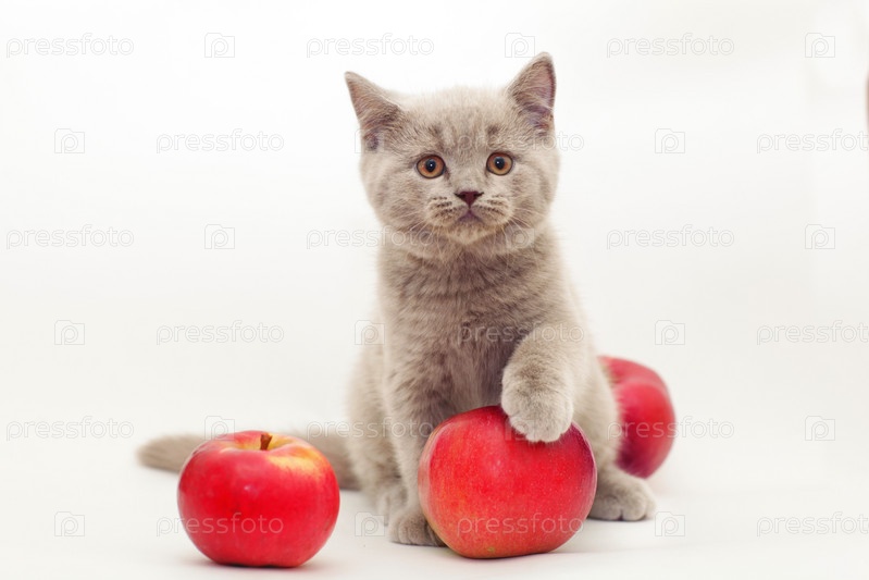 Серый котенок с красными яблоками