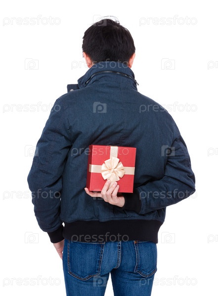 Молодой человек с подарком за спиной