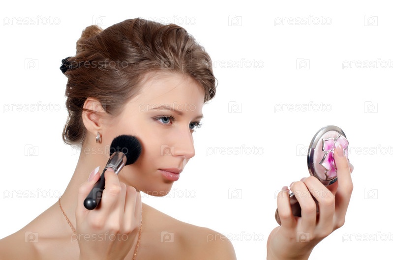 Красивая женщина делает естественный макияж на белом фоне