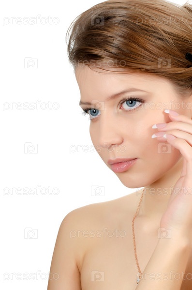 Красивая женщина с естественным макияжем и французским маникюром на белом фоне
