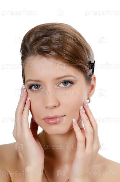 Красивая женщина с естественным макияжем и французским маникюром на белом фоне