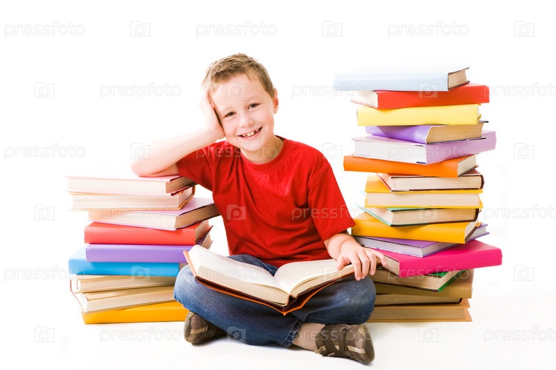 Изображение школьника, сидящего между двумя кучами книг и читающего одну из них