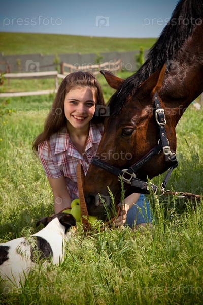 Девушка с корзиной яблок, лошадь и собака на поляне