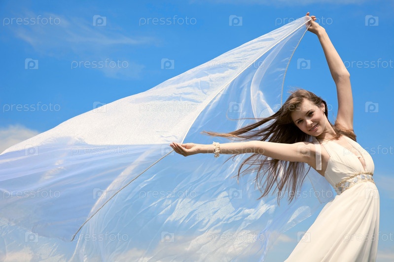 Девушка с развевающейся прозрачной белой тканью на фоне голубого неба