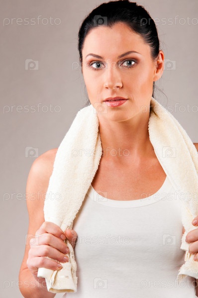 Спортивная девушка с полотенцем на плечах, на сером фоне