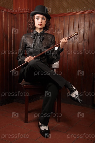 Девушка в ретро-одежде и с тростью в руках сидит на деревянном стуле