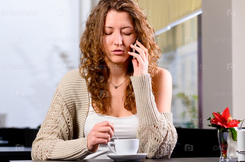 Девушка разговаривает по телефону в кафе