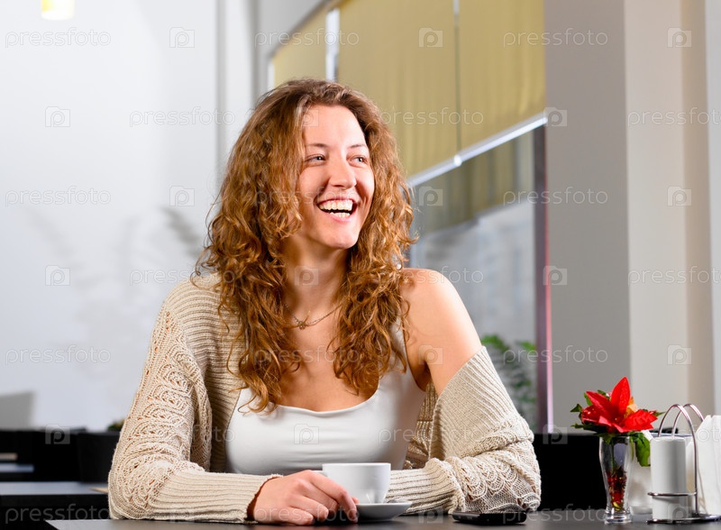 Счастливая девушка в кафе с кружкой кофе