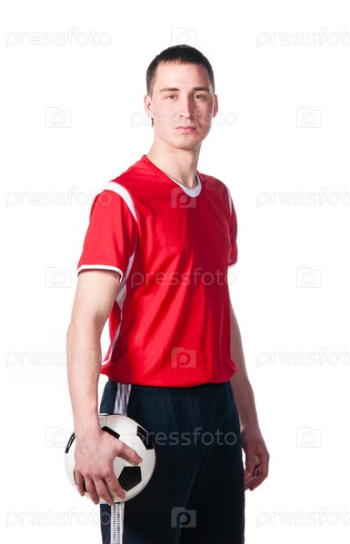 Футболист с мячом в руке на белом фоне