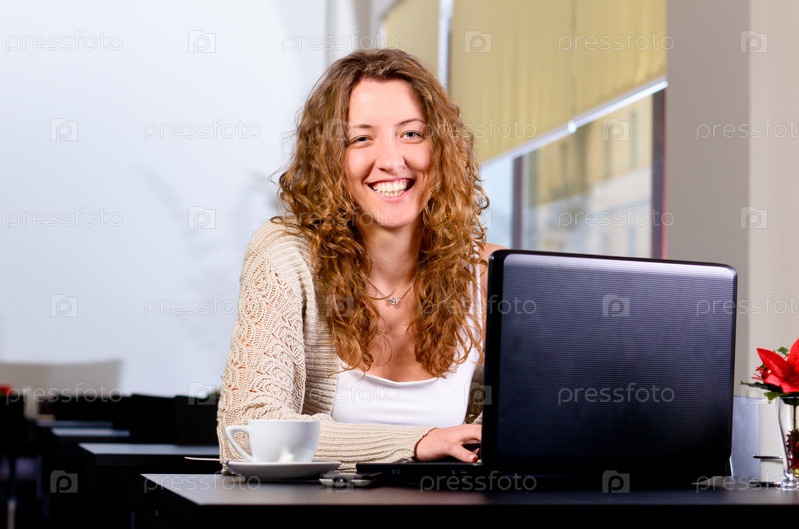 Молодая женщина сидит в кафе с ноутбуком