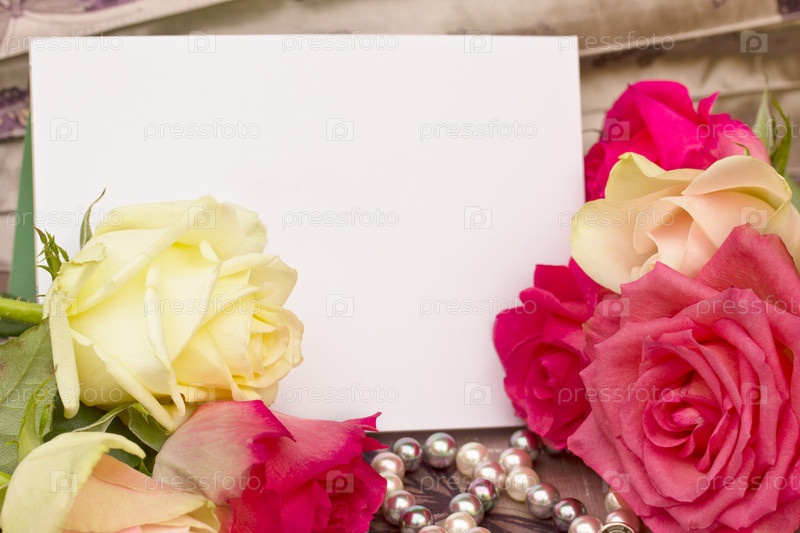 Пустая визитка для поздравления на фоне красивых роз и жемчуга