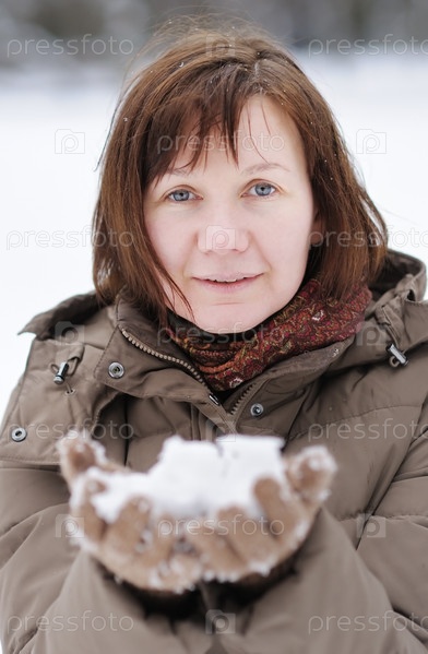 Женщина держит в ладонях снег