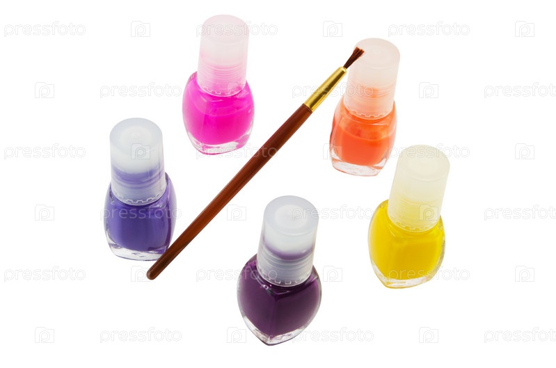 Бутылочки с разноцветными лаками для ногтей и кисточка на белом фоне
