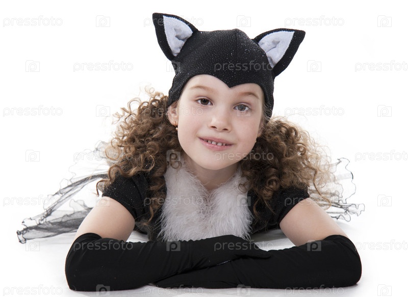 Девочка в костюме черного котенка на белом фоне