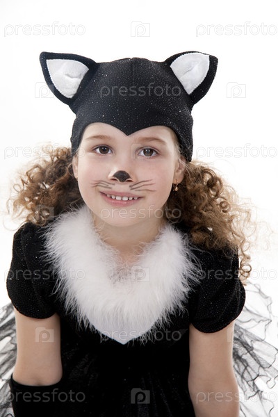 Девочка в костюме черного котенка на белом фоне