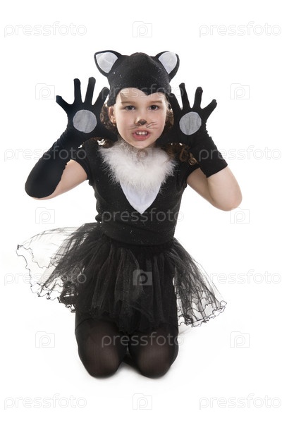 Девочка в костюме черного котенка на белом фоне