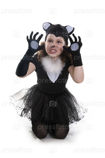 Девочка в костюме черного котенка на белом фоне