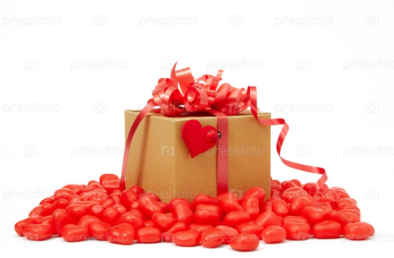 Подарочная коробка с красной лентой и красные сердца