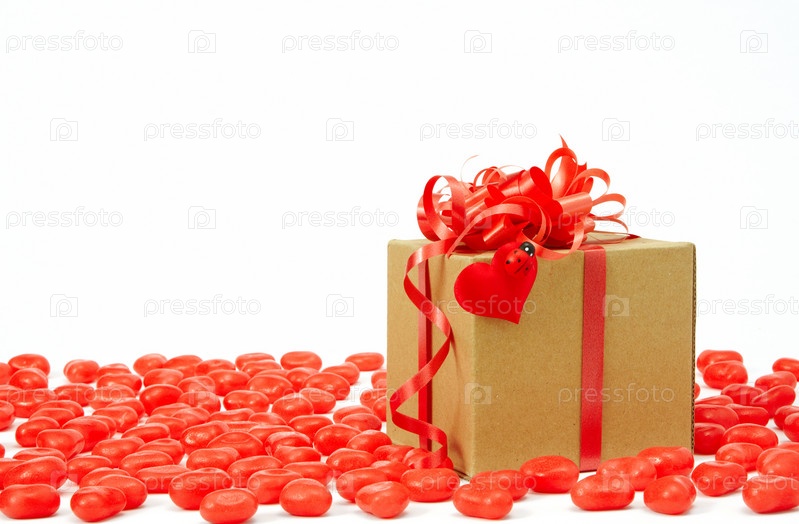 Подарочная коробка с красной лентой и красные сердца