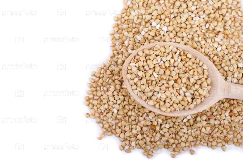 Гречка в ложкой на белом фоне