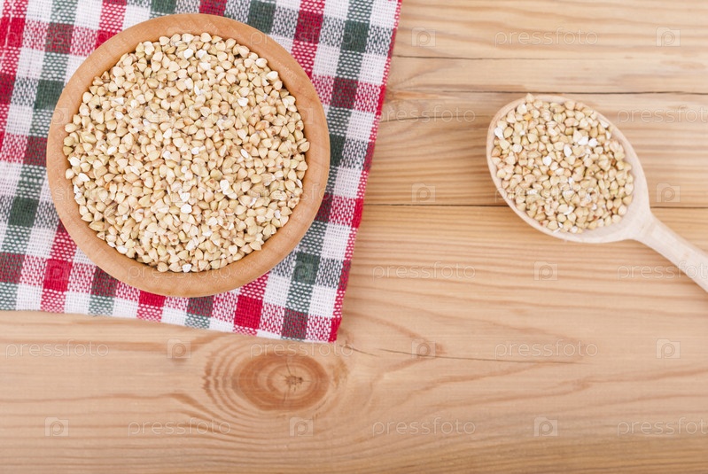 Гречневая крупа в миске на деревянном столе