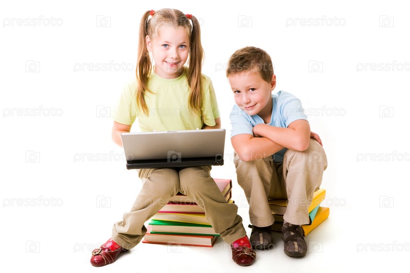 Умная девушка с ноутбуком и милый мальчик рядом, глядя в камеру