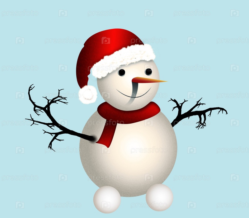 Снеговик в новогодней шапке на голубом фоне