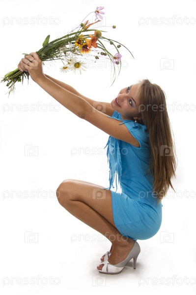 Девушка с букетом цветов, изолирована на белом