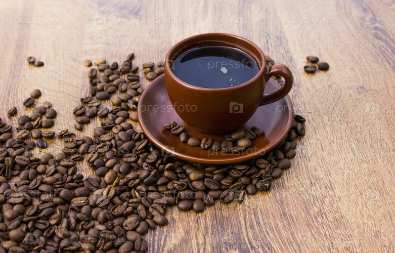 Чашка кофе на фоне деревянные с кофе в зернах