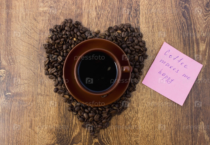 Чашка кофе на фоне деревянные с кофе в зернах