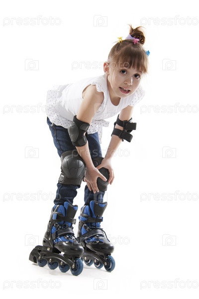Маленькая девочка на роликах. Изолированно на белом