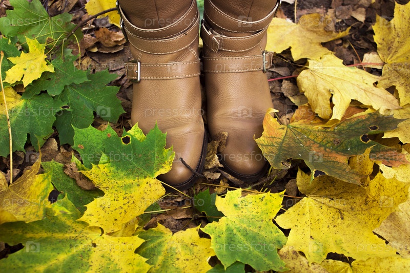 Женские ноги в сапогах макро среди опавших листьев