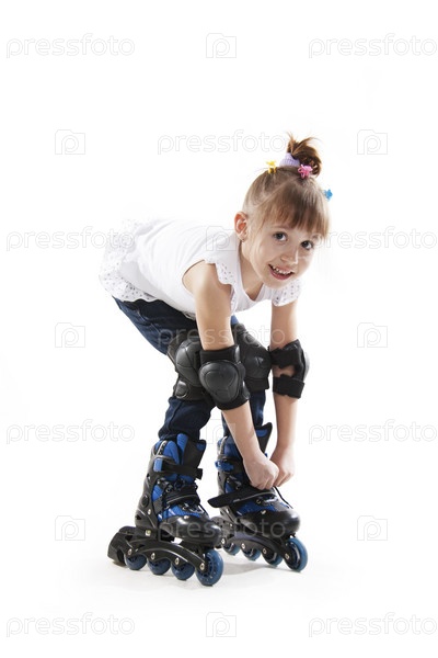 Маленькая девочка на роликах. Изолированно на белом