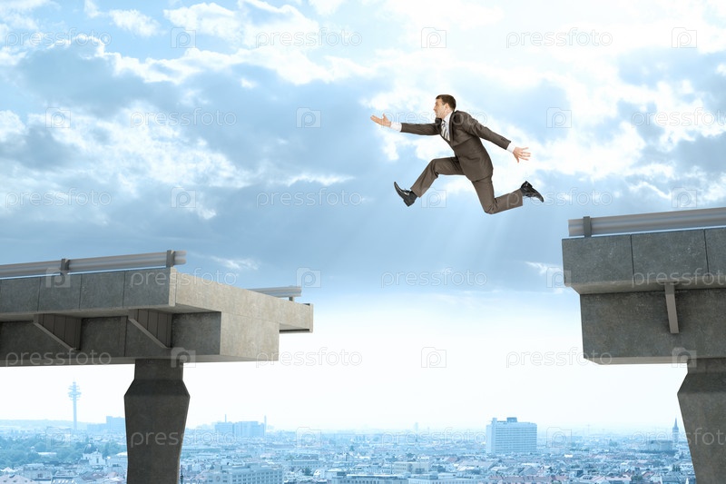 Изображение молодого бизнесмена с чемоданом, перепрыгивая через разрыв