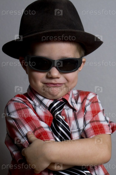 Мальчик в шляпе и черных очках на сером фоне