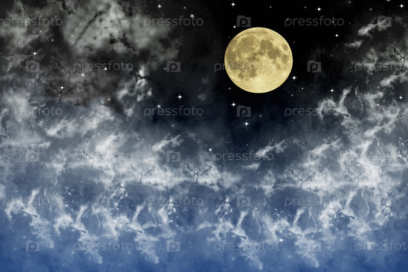 Ночное небо. Полная Луна на звездное небо с облаками