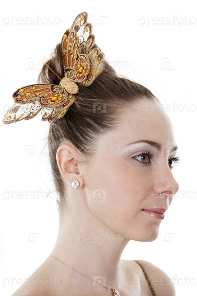 Портрет красивой молодой женщины с бабочкой в волосах