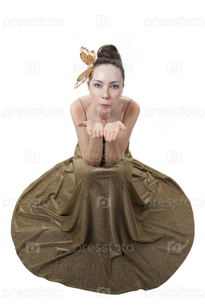 Женщина в праздничном, золотом, длинном платье - сидя на белом фоне