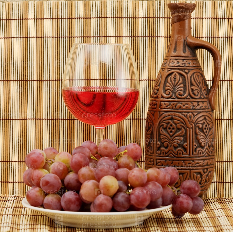 Бутылка вина, бокал и виноград