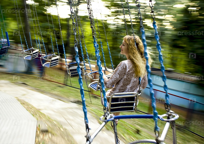 Молодая красивая девушка едет на качели подвесные на цепи. Размытие движения